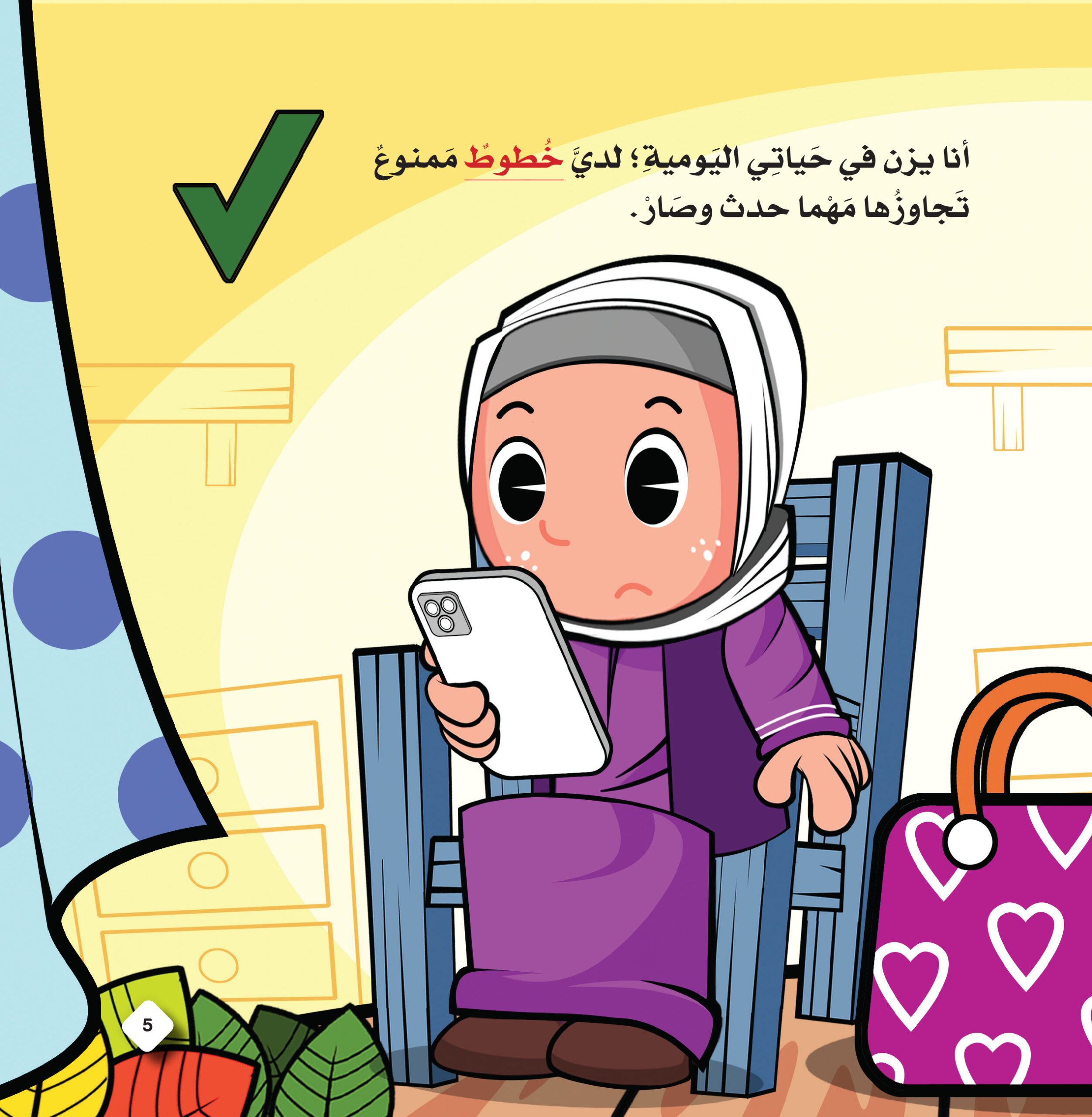 كما تتضمن الخطوط الحمراء التي يضعها “يزن” تحت التصرفات الخاظئة مثل: التعامل مع النار، ضرب أخيه الصغير، السماح للغرباء بلمس جسده، إخفاء الأسرار عن والدته، استخدام ألفاظ سيئة، الرسم على الجدران، استخدام اللوح الإليكتروني لفترات طويلة.