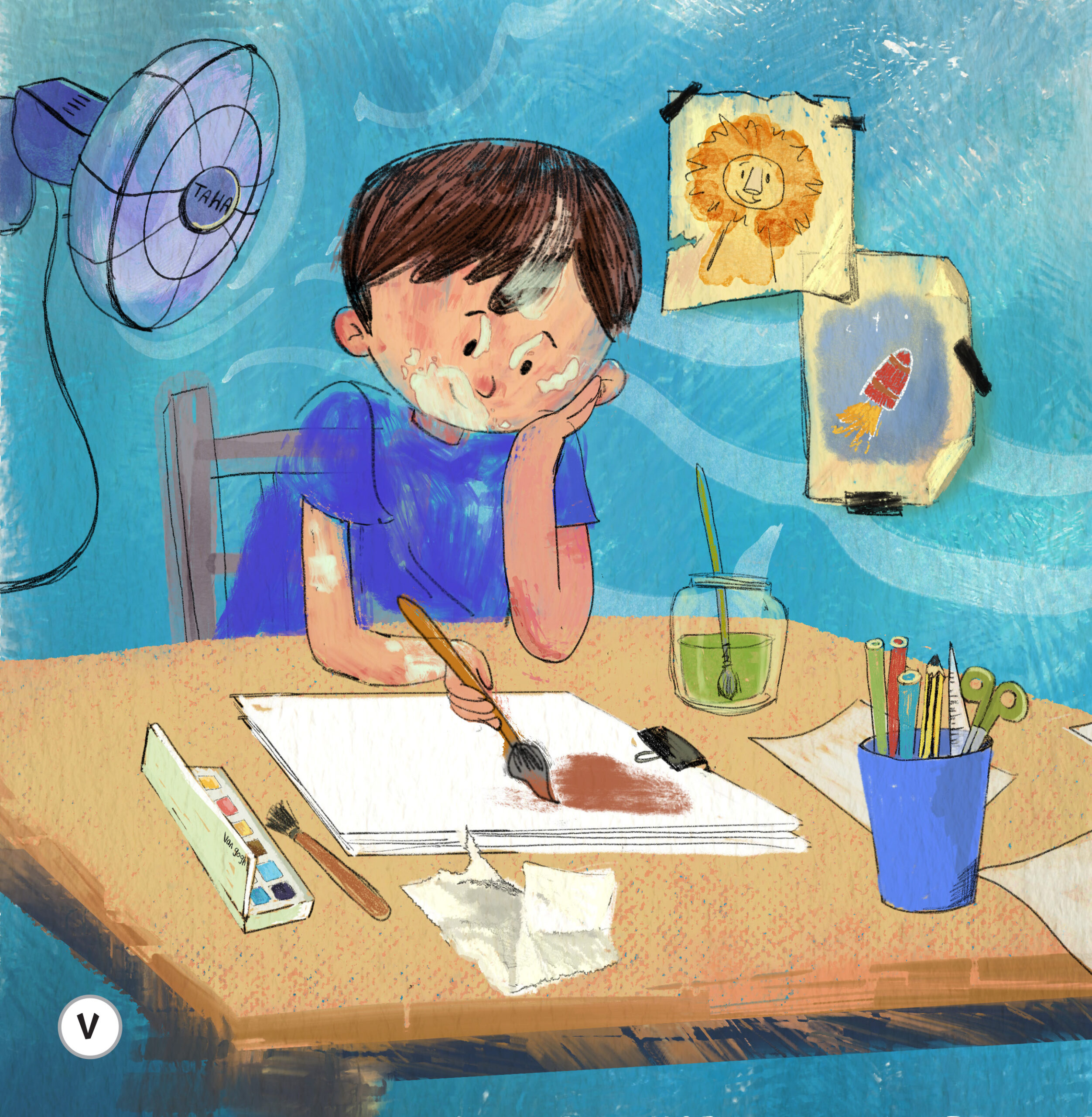 ولكن أثناء تجربته للألوان الجديدة على كراسته الجديدة، نزلت بقعة كبيرة من اللون الأزرق على رسمته، فحزن أحمد كثيرًا وحاول محوها بالممحاة او بتغطيتها باللون الأبيض، لكن دون جدوى، لذا قرر أن يحول هذه البقعة الزرقاء إلى رسمة جميلة بإضافة بعض التفاصيل، وهكذا قام أحمد برسم المزيد من البقع الملونة وحولها إلى رسومات جميلة بتفاصيل بسيطة.