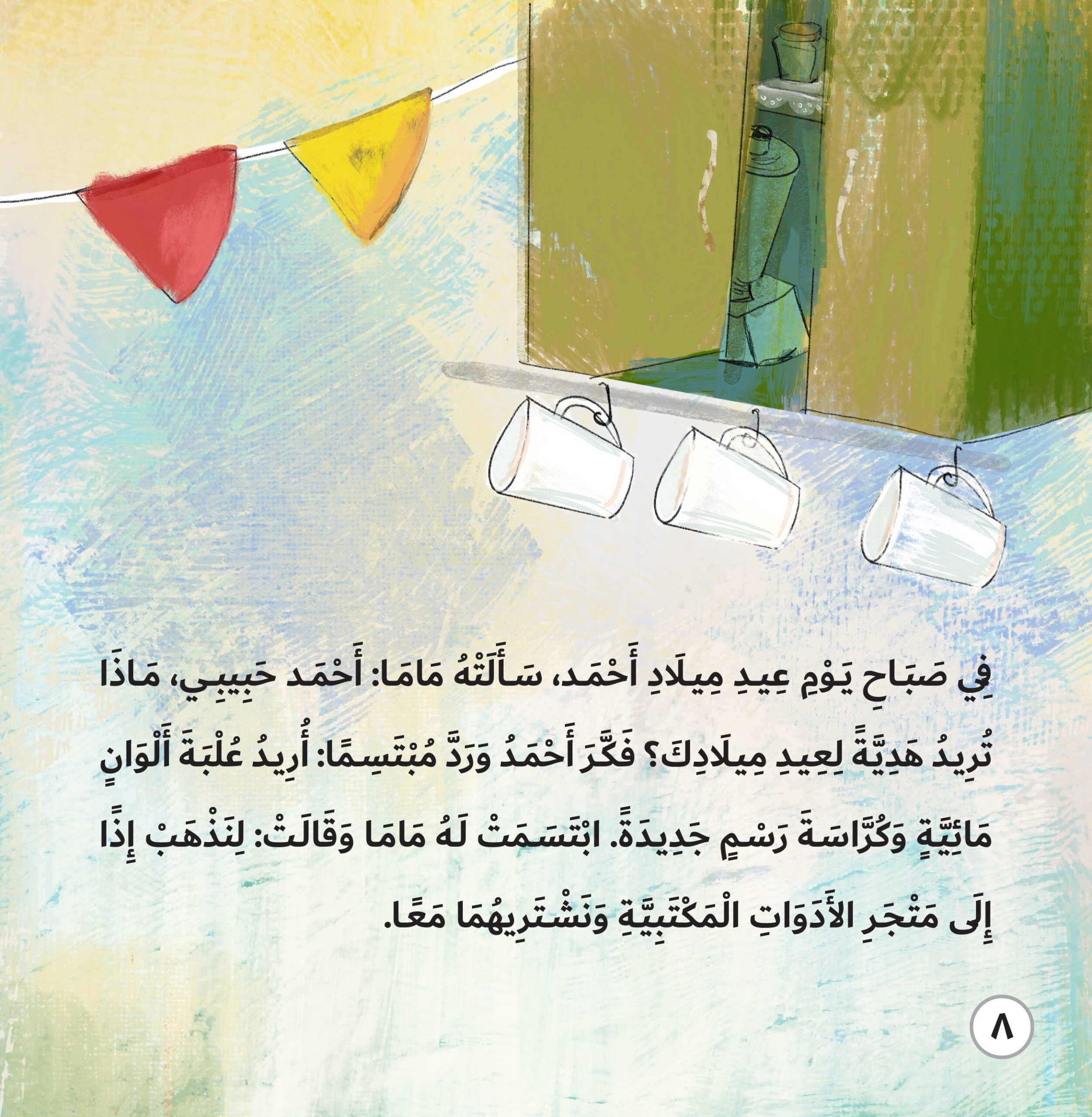 تدور القصة حول الطفل “احمد” الذي يحب الرسم كثيرًا لذا يذهب مع والدته لشراء علبة ألوان وفرشاة تلوين وكراسة رسم جديدة بمناسبة عيد ميلاده.