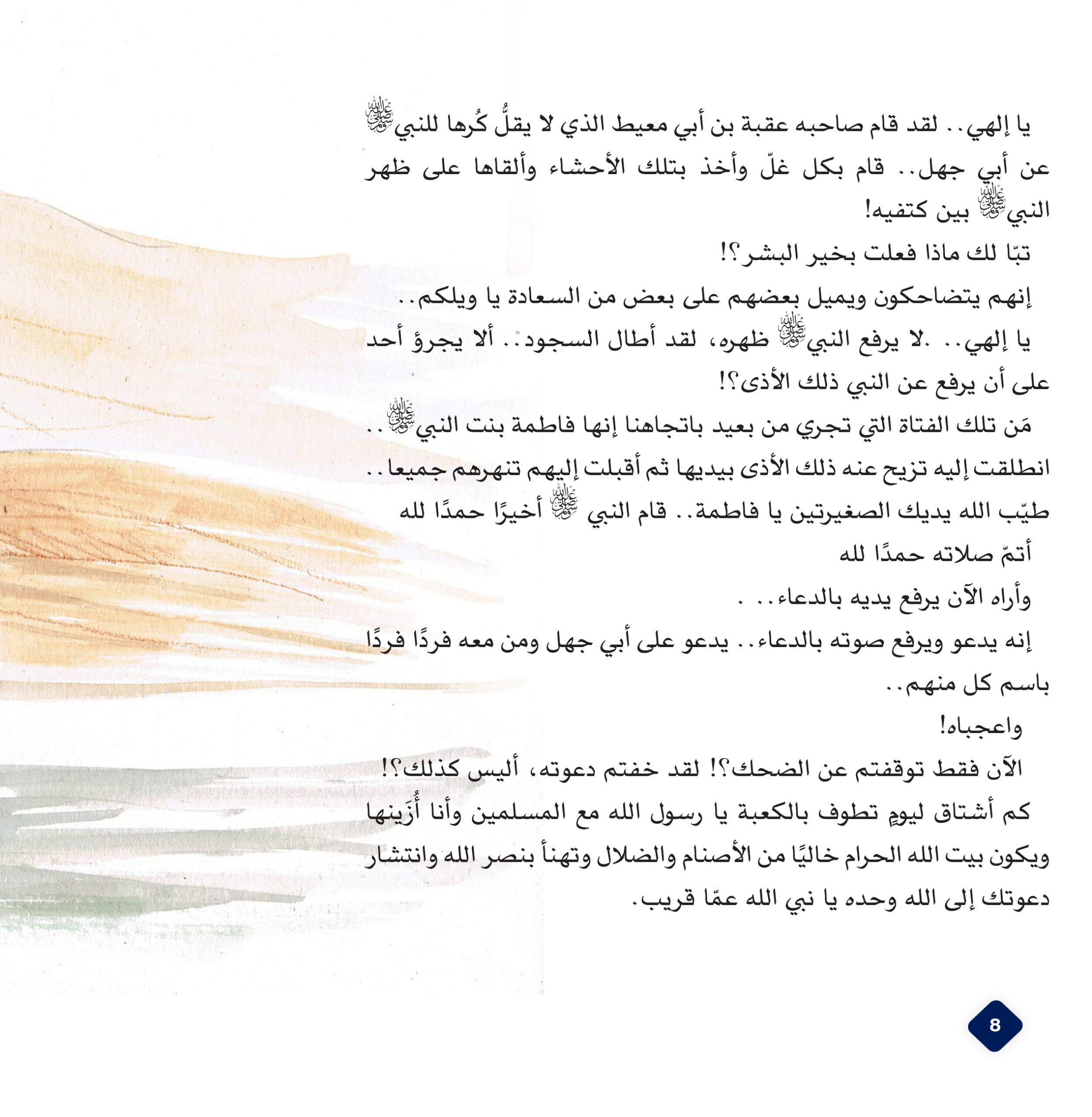 ويحكي قصة الكتاب كائنات عاشت مع النبي محمد صلى الله عليه وسلم؛ وهى: أستار الكعبة التي شهدت دعوة النبي صلى الله عليه وسلم للإسلام، وإيذاء المشركين له، إناء خديجة الذي شهد صبر ودعم السيدة خديجة رضي الله عنها لزوجها صلى الله عليه وسلم، عصا أبي طالب التي شهدت دعم أبو طالب لابن أخيه النبي صلى الله عليه وسلم الذي رفض ترك دعوته للإسلام، متاع رقية الذي أهدته السيدة خديجة رضي الله عنها لابنتها رقية في يوم زواجها من عثمان بن عفان، والذي شهد حياة رقية وزوجها وثباته على دين الحق، قوس حمزة الذي جعله الله عز وجل أداة للدفاع عن رسوله صلى الله عليه وسلم، والذي شهد إسلام سيده حمزة بن عبد المطلب، سيف عمر الذي شهد ما حدث في بيت أخت عمر بن الخطاب فاطمة وزوجها سعيد بن زيد، باب الدار وهو باب بيت الأرقم بن أبي الأرقم الذي كان يجتمع فيه النبي صلى الله عليه وسلم بأصحابه، حجر يشهد وهو الحجر الأسود بالكعبة الذي شهد محاولة أبو الوليد عتبة بن ربيعة لإقناع النبي صلى الله عليه وسلم بترك دعوته للإسلام، سنبلة في الشِعب التي شهدت رحلة حكيم بن حزام إلى شِعب بني طالب لتوصيل بعض الطعام للرسول صلى الله عليه وسلم وأهله، وأرضة الصحيفة التي أمرها الله عز وجل بأن تأكل صحيفة مقاطعة أهل النبي إلا ذكر الله عز وجل بها.