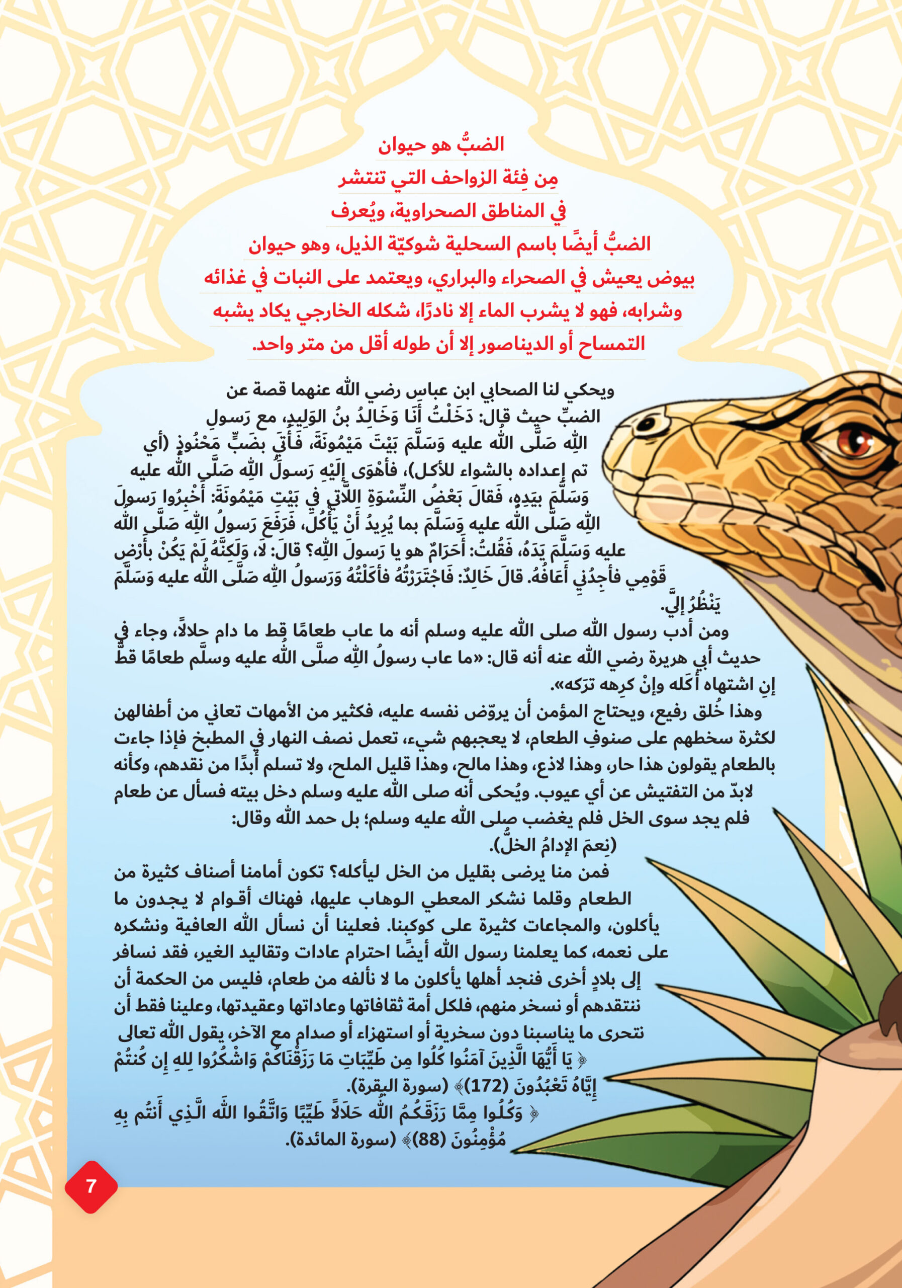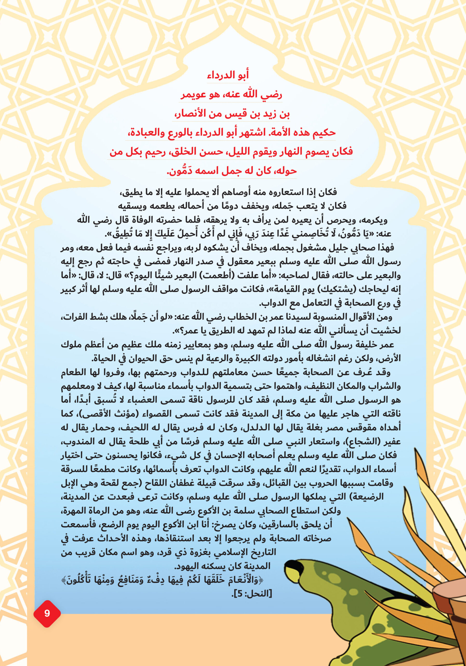 ويتناول الكتاب قصص عن مجموعة من الحيوانات؛ هى: الضب، الجمل الذي كان يمتلكه الصحابي أبو الدرداء رضي الله عنه واسمه “دَمُّون”، الأغنام والتي كان يرعاها الصحابي عبد الله بن مسعود رضي الله عنه، العقرب، الشاة الملقبة بشاة أم معبد؛ التي كانت تمتلكها السيدة عاتكة بنت خويلد الخزاعية، العصفورة وفرخيها، الجراد، الكلب، النمل، الفيل الأبيض، الدجاجة، العنكبوت وحمامتان.